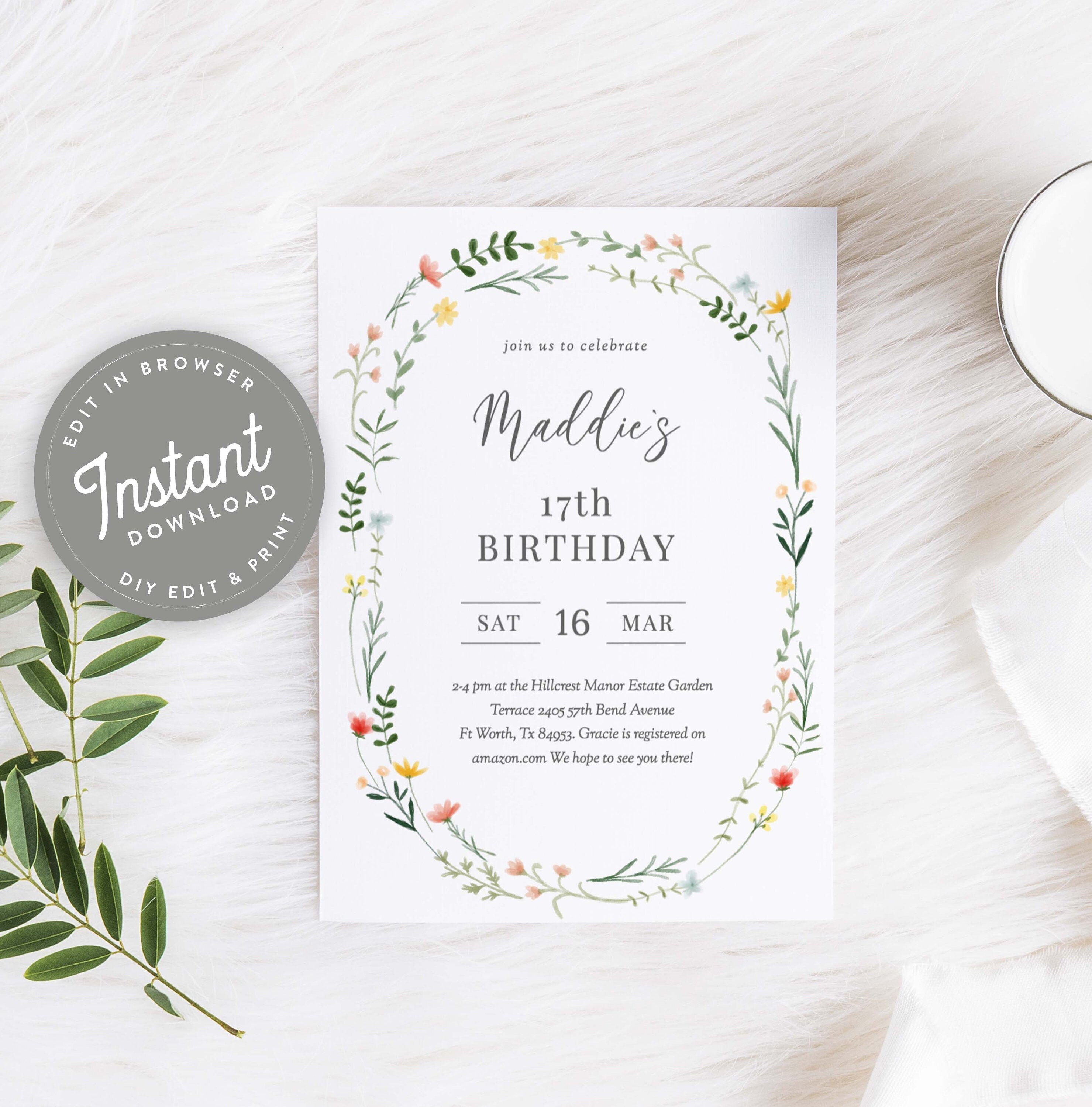 Editable 17th Birthday Invitation Template Girl Wildflower Etsy India
